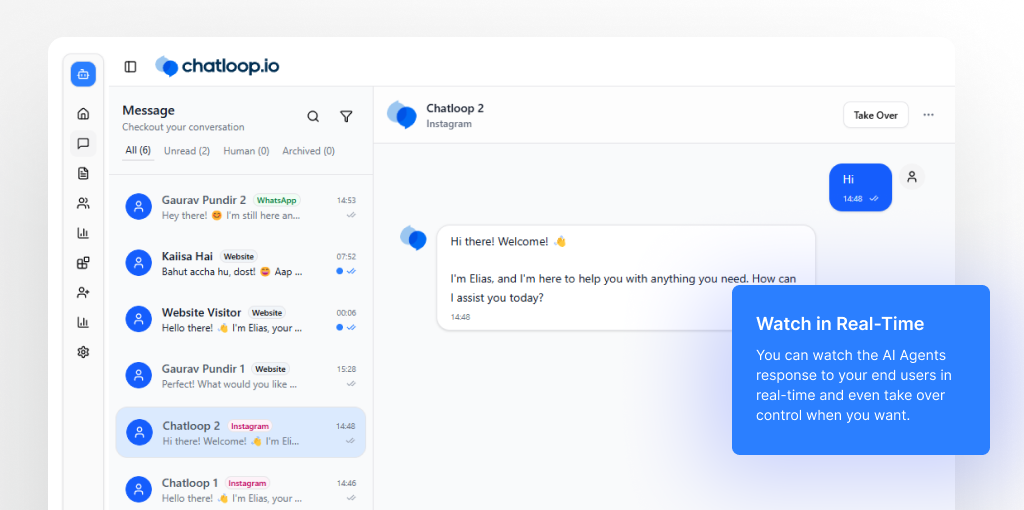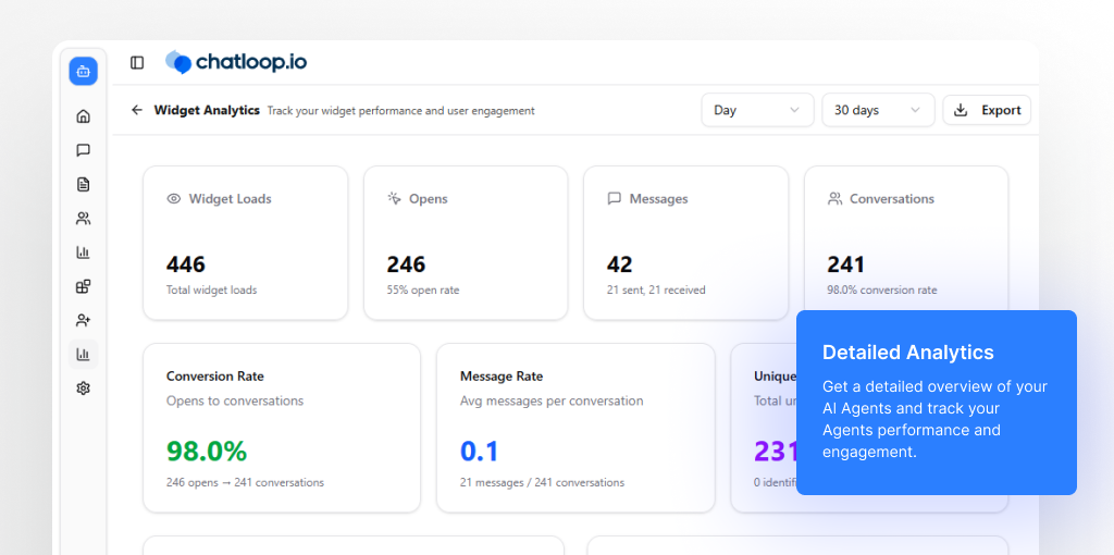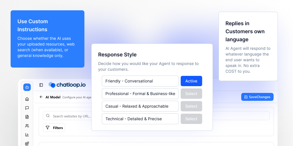 Chatloop.io uses intelligent AI to handle inquiries instantly, resolve common issues, and provide relevant information so your customers get immediate help without waiting for a human agent.